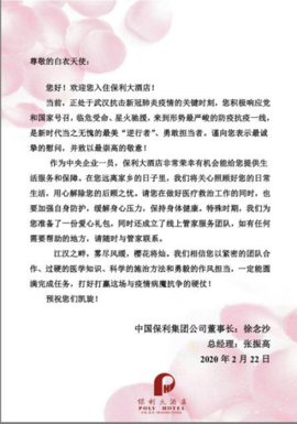 2月21日下午,由173人组成的内蒙古援汉医疗队顺利入住湖北保利大酒店。保利集团领导徐念沙、张振高获悉后,专门发来慰问信,对医疗队表示慰问和敬意。