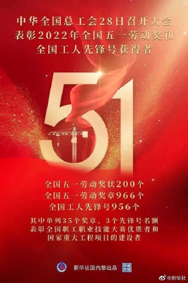 4月28日,中华全国总工会召开大会表彰2022年全国五一劳动奖和全国工人先锋号获得者,全国五一劳动奖状200个,全国五一劳动奖章966个,全国工人先锋号956个。其中,保利集团共3名员工,被授予“全国五一劳动奖章”。