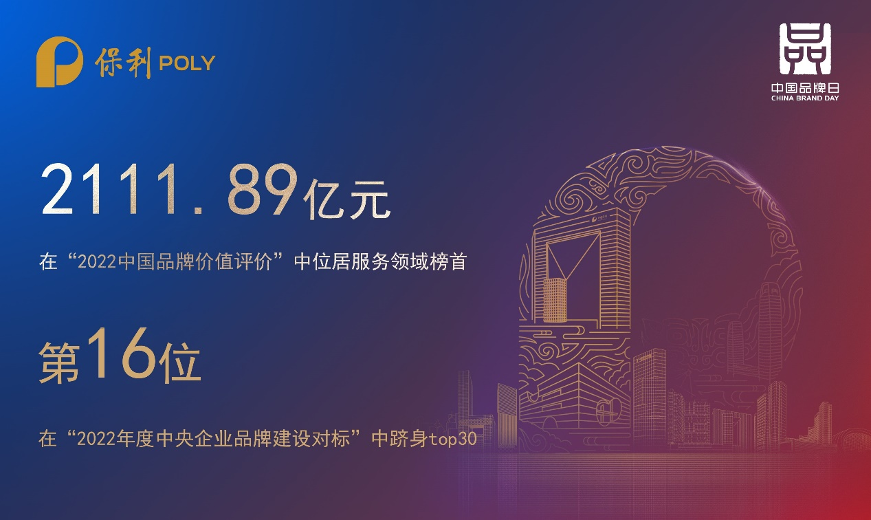 在由国务院国资委发布的“2022年度中央企业品牌建设对标”中,保利集团位列第16位;在新华社、中国品牌建设促进会、中国资产评估协会等单位联合发布的“2022中国品牌价值评价”榜单中,保利集团以2111.89亿元的品牌价值位居服务领域榜首,反映出保利集团践行品牌战略“十四五”规划、推进品牌建设专项提升行动以来,始终聚焦满足人民日益增长的美好生活需要,以高质量发展推动世界一流企业建设的品牌成效。