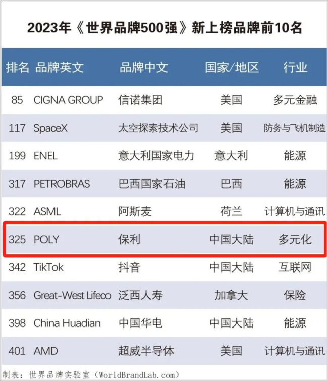 12月13日,由世界品牌实验室(World Brand Lab)独家编制的2023年度(第二十届)《世界品牌500强》排行榜揭晓。保利集团从全球约8000个知名品牌中脱颖而出,首次入榜,在新入选的中国品牌中排名第一,位列总榜第325位。