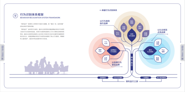 《保利品行-保利集团行为手册》搭建卓越行为识别体系框架,明晰了全体保利人的卓越行为倡导,以共同行为准则、基本礼仪规范、关键品牌触点行为支撑品行之树,规范全体保利人的知与行。