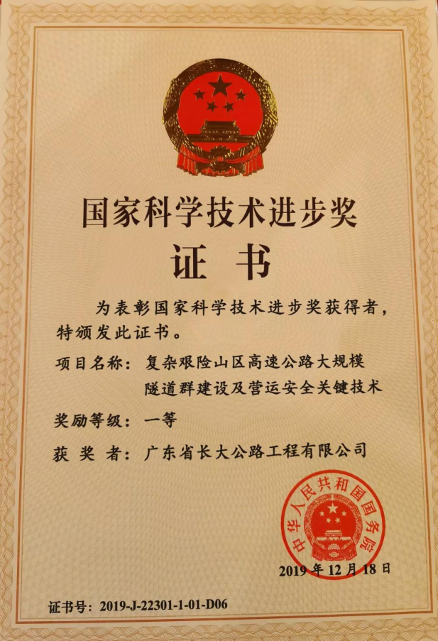 1月10日,2019年度国家科学技术奖励大会在北京人民大会堂举行。保利长大参与完成的科研成果“复杂艰险山区高速公路大规模隧道群建设及营运安全关键技术”荣获2019年度国家科学技术进步一等奖。该成果极大增强了我国在高速公路核心关键技术上的国际竞争力,推动了行业科技进步。