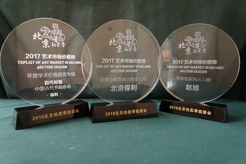 2017年3月2日,由北京商报社、北京拍卖行业协会主办的“2017艺术市场价值榜暨2016北京拍卖季年度行业峰会”在京举行。经过专家评审会和媒体评审的讨论评定,保利拍卖荣获“2016年度品牌影响力拍卖企业”、“2016年度学术价值拍卖专场”、“2016年度拍卖风云人物”三项殊荣。