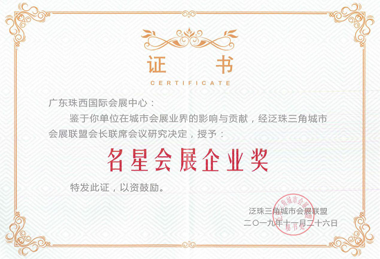 由中国会展经济研究会、泛珠三角城市会展联盟主办的第四届《中外会展大讲堂》颁奖典礼于近日举办,由保利会展运营的广东珠西国际会展中心凭借优异的场馆管理运营表现,获颁 “名星会展企业奖”。