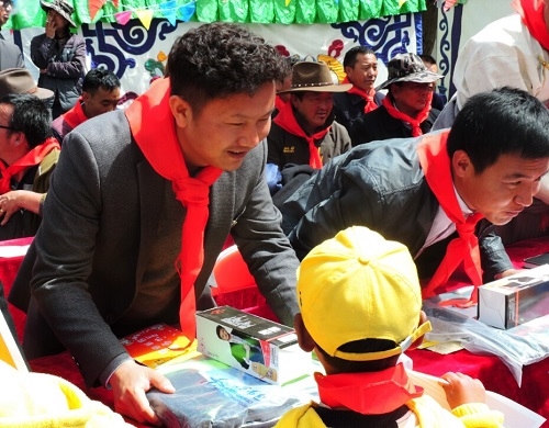 甲玛乡中心小学的少先队员们为保利嘉宾佩戴红领巾,罗旦校长发表欢迎辞,对参加活动的爱心人士表示热烈欢迎和衷心感谢。
