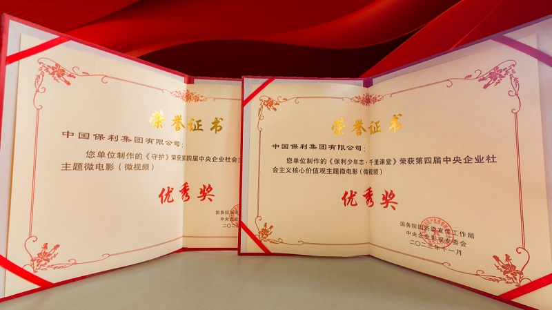 近日,国务院国资委宣传工作局(党委宣传部)举行第四届中央企业社会主义核心价值观主题微电影(微视频)展映发布活动,现场发布大国重器、敬业奉献、社会责任、初心使命等四个主题100部优秀作品。由保利集团选送的《守护》《保利少年志·千里课堂》两部作品入选,展现出新时代保利人以领创美好生活为己任,不断满足人民衣食住行用和精神文化需求、用卓越品质诠释央企责任担当的精神风貌。