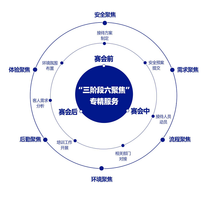 由保利商旅打造的“三阶段六聚焦”专精服务模式,围绕赛会前、中、后三大阶段,做好安全聚焦、需求聚焦、流程聚焦、环境聚焦、后勤聚焦、体验聚焦。在接待方案制定、安全预案提交、接待人员动员、相关部门对接、培训工作开展、客人需求分析及环境氛围布置七大方面,全方位保障重大任务,力求实现“高峰会服”的专业、高效、安全、体贴。