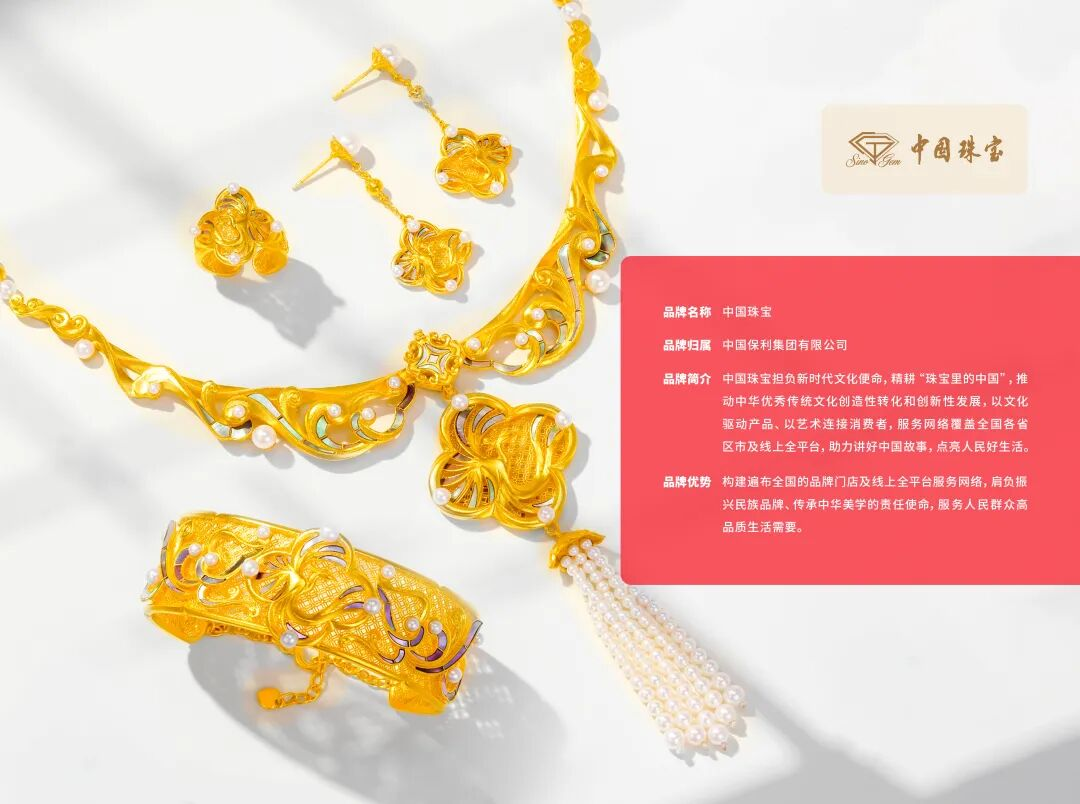 中国珠宝秉承“用璀璨珠宝点亮人民美好生活”的使命,不断为广大消费者提供高品质的珠宝首饰产品与值得信赖的优质服务。凝千年文脉,铸时代精品。打造千余款原创产品,创新运用珐琅、花丝等非遗技艺创新应用,建设研发设计中心、检测中心及产学研基地,推出搭载华为智能机芯的时尚腕表,自主研发的五芒金钻系列获行业科技奖。创优质体验,筑美好生活。构建全域服务生态,零售网络覆盖全国线下2000+门店及线上主流平台,打造“中华美学生活方式体验馆”,入选北京市直播电商优秀案例,获IAI传鉴国际广告奖、金狮国际广告影片奖等多个奖项,持续为人民美好生活贡献保利力量。