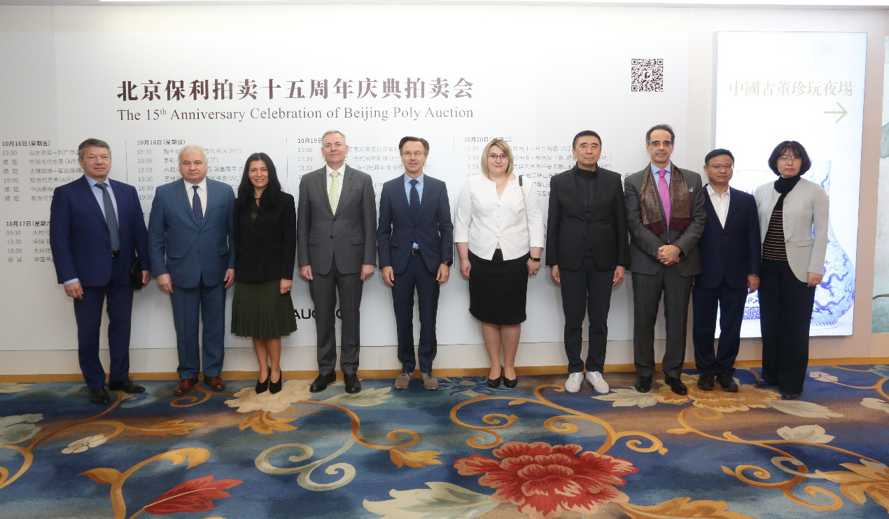 On October 15th, representatives of 13 diplomatic envoys from 7 countries in China, including Russia, Austria, Belarus, Peru, Montenegro and Germany visited the pre-exhibition of Beijing Poly 2020 Autumn Auction held at China World Summit Wing. Among them, the Russian ambassador and the Austrian ambassador came to the site and had a detailed understanding of the Chinese contemporary painting and calligraphy, modern painting and calligraphy, antique treasures and other fine works of art for this year's autumn auction. The staff from Poly Auction introduced the characteristics of the lots and the charm of the Chinese culture and history to the envoys. The ambassadors and other foreign guests demonstrated interests in the Chinese culture. They not only listened carefully to the introduction, but also asked questions about artworks from time to time.